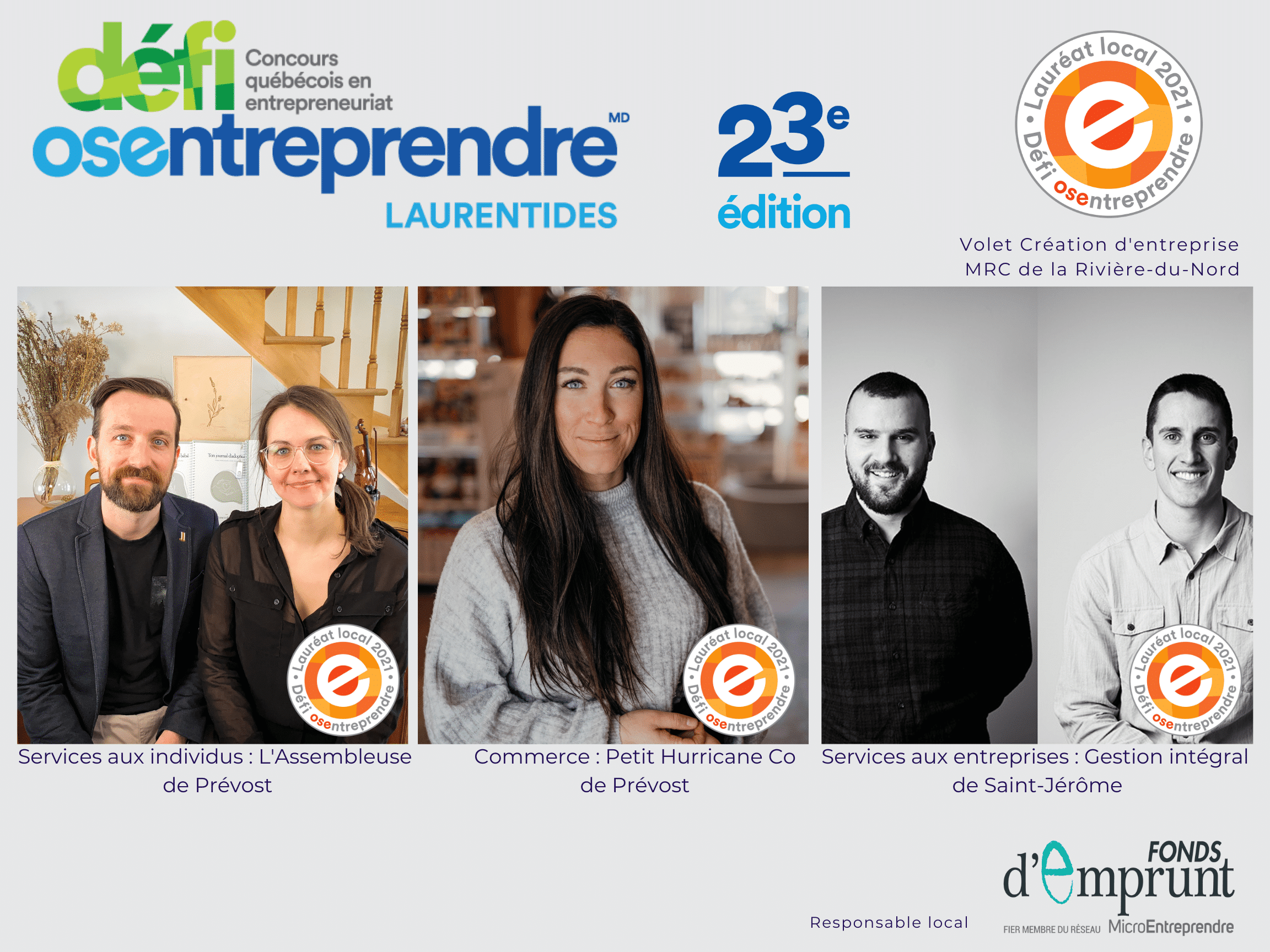 Lors de ce gala virtuel, le jury a nommé trois lauréats qui se sont démarqués par la qualité de leur projet, leur créativité et leurs valeurs. Il s’agit de L’Assembleuse inc. de Prévost dans la catégorie Service aux individus, Petit Hurricane Co également de Prévost dans la catégorie Commerce et Gestion Intégral de Saint-Jérôme dans la catégorie Services aux entreprises. Ces trois entreprises passent maintenant à l’échelon régional du Défi OSEntreprendre. Le jury souhaitait mettre en lumière une autre entreprise, cette fois de Saint-Colomban, Couleurs Sourires inc. en la nommant coup de cœur du jury.