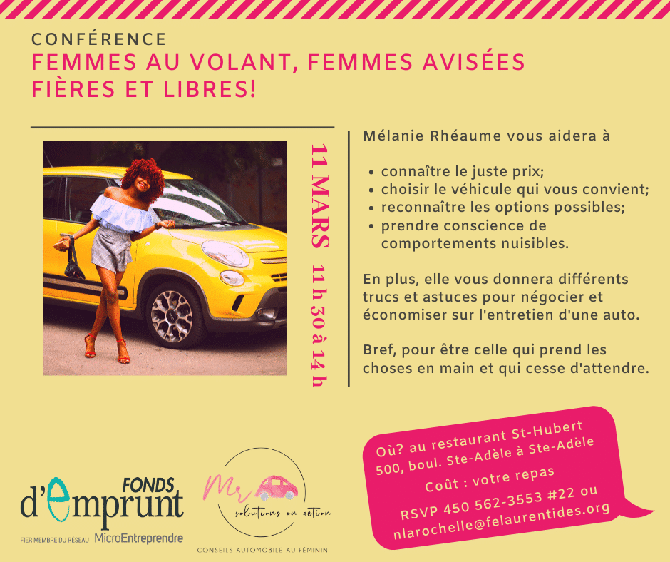 rte de 18 ans d’expérience dans le domaine de l’automobile qu’elle met au service d’autres femmes comme elle et des jeunes conducteurs futurs propriétaires de voiture. Elle partage sa passion de la mécanique et de l’automobile avec vous afin de vous offrir tous les outils nécessaires pour être des consommatrices averties et avisées ( et consommateur